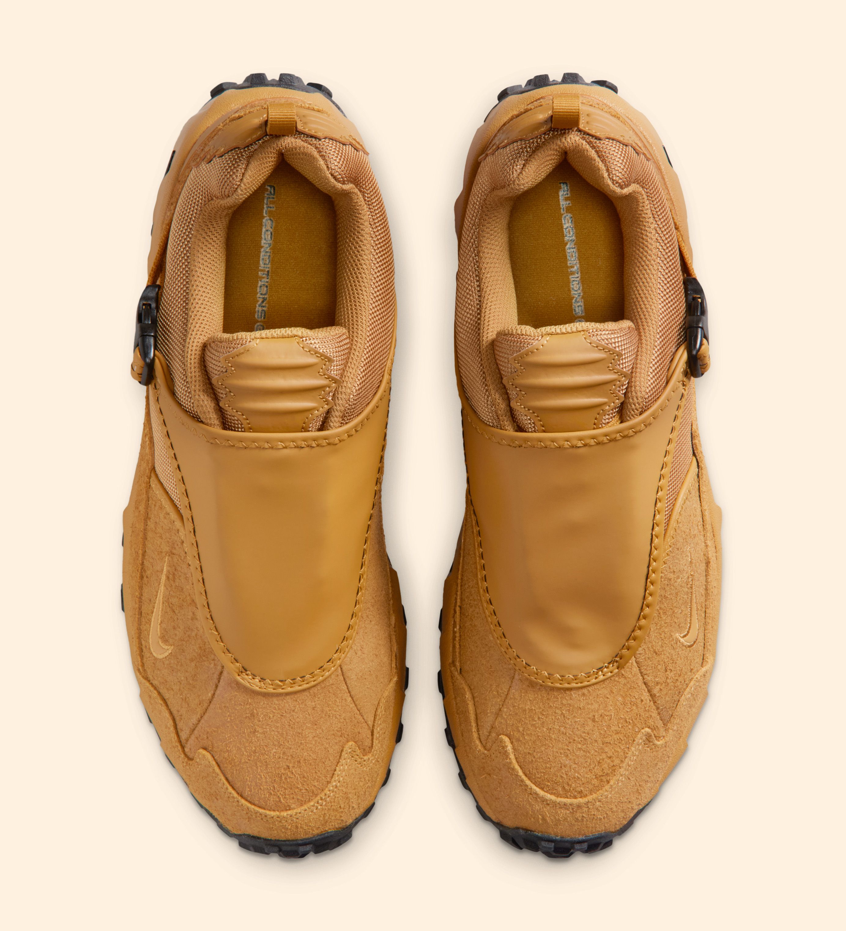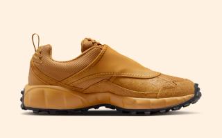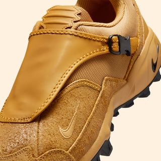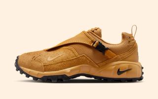The “Golden Harvest” palette leans heavily into that utilitarian DNA. Wheat-toned suede overlays wrap the mudguard and midfoot, delivering a rough, tactile finish that feels built for dirt, debris, and whatever else the trail throws back. Mesh panels in complementary earth tones keep things flexible, while the signature zippered shroud adds structure and weather resistance up top. Subtle Swoosh branding is stitched into the side panels, with additional hits worked into the midsole and heel without overpowering the design.