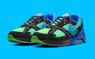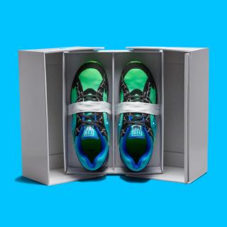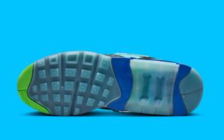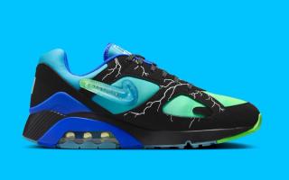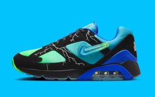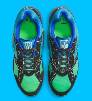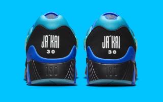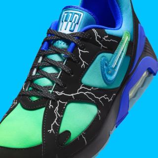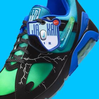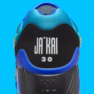 The sneaker features a sleek black suede overlay with electrifying lightning bolt graphics, embodying Ja’Kai’s energetic spirit. Beneath this, a gradient midsole fades from electric green to royal blue, adding a dynamic pop of color. Translucent icy outsoles elevate the design, paired with a Jewel Swoosh logo—a first for the Air Max 180.
