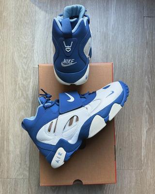 The Nike Air Diamond Turf 2 "Kansas City Royals" arrives dressed in a clean blend of royal blue and soft sail, echoing the team’s classic colors. Blue overlays wrap the upper and midfoot strap, while textured white leather panels fill the base. Signature details remain intact: the bold forefoot strap with Swoosh branding, sculpted midsole pods with visible Air cushioning, and the unmistakable heel insignia that defined the Turf line in the mid-1990s.
