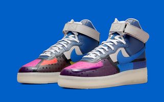 Delivered in a similar styling to this recently-revealed Air Max 1, this AF1 high arrives in a heritage leather and mesh construction, before being wrapped and taped in colorful glaze panels across the forefoot and mudguard line. The atypical panels work in pink, blue, yellow, and magenta with triangles, polka dots, stars and plus marks all present. It’s capped off with a tonal gloss Swoosh at the lateral toe, before returning to something more recognizable underfoot, with a jelly sole unit resting below to complete the design.