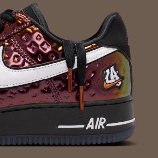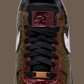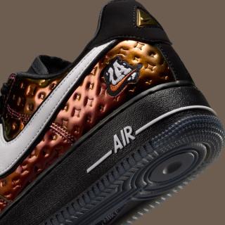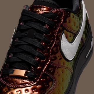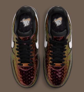 The upper is dressed in a high-gloss leather that shifts between bronze and green depending on light. The effect is similar to the polished treatment seen on the Louis Vuitton Air Force 1s, though applied here in a more restrained way. Embossed detailing covers the panels, adding texture without breaking up the familiar AF1 lines.