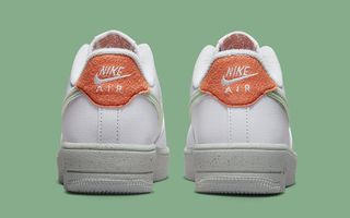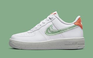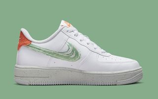Settling on a staple white leather upper, the pair shuffles quickly to incorporate some color, with the titular Swoosh in muted green reaching back to rugged orange suedes at the heel. The traditional Swoosh overlay rests atop in translucent TPU, all of which rests atop a cement grey sole unit that has been peppered with Grind Rubber flakes. Capping off the design are some minor brandmark at the tongue (in orange) and over the vamp (in green).