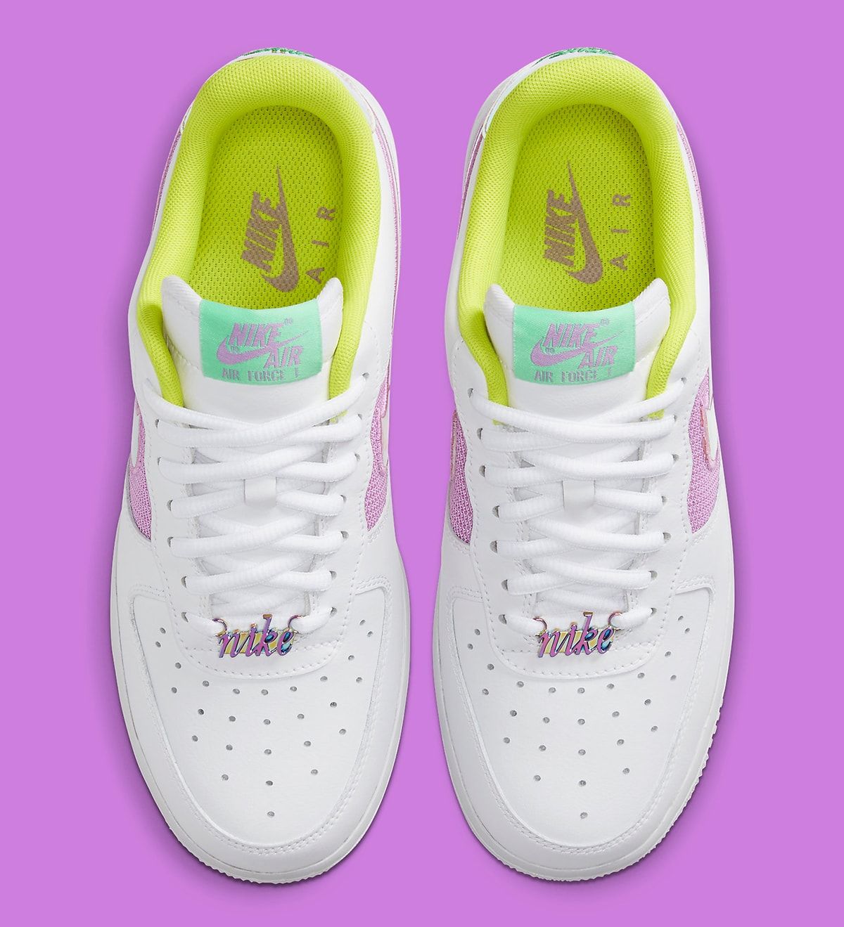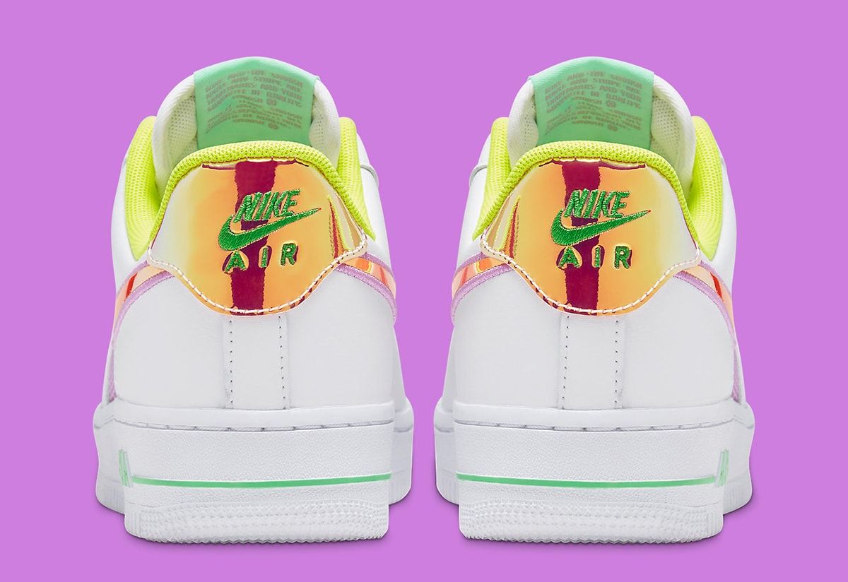 Here, a classic Triple White Uptown is served as the base before Nike piles on the flair. First up is the replacement of the mid panel for vibrant fuchsia netting, while equally bold colors on the liner (volt) and tongues (mint) provide eccentric character. The champion of the pair lies with its iridescent gold-orange Swooshes and heel overlays, with cursive Nike dubraes at the forefoot arriving ina like finish. More hits of green arrive at the heel embroidery and midsole detail, with volt green insoles and white laces completing the design.