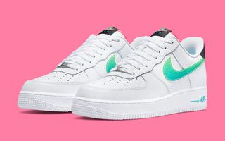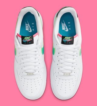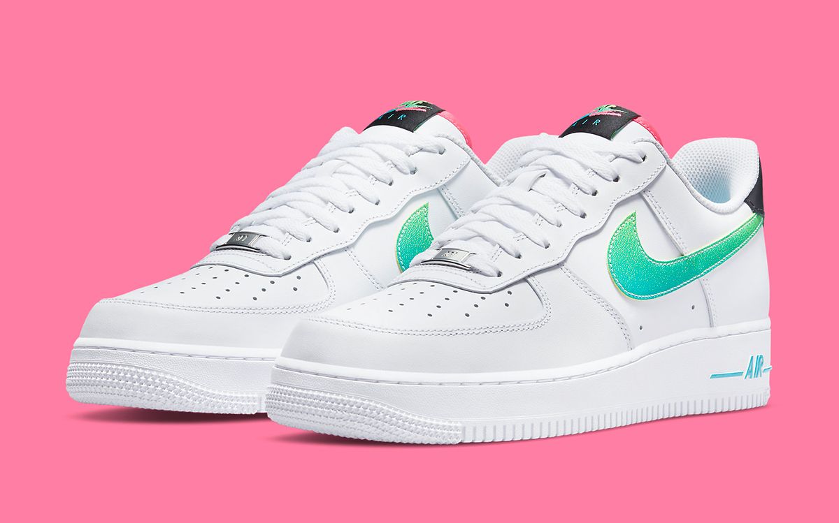 Like the majority of AF1 options for Spring/Summer, the pair starts out on a classic all-white base, with staple smooth leathers and white sole units providing a blank canvas for the embellishments to pop. Here, the Swoosh has opted for a multitude of vibrant hues, including green, blue, teal, pink, and black — popular amongst designers of the early 90’s era. The graphic tongue tags cement the era’s influence on the pair, working through rainbow-like gradients seen so prevalently on Nike’s clothing during the period. Swoosh overlays carry that theme, too, featuring a Tech Challenge 2-like splatter gradient of green and volt, and the pair is capped off with a slew of color pops at the tongue liner, insoles, rear branding, and midsole paintwork.