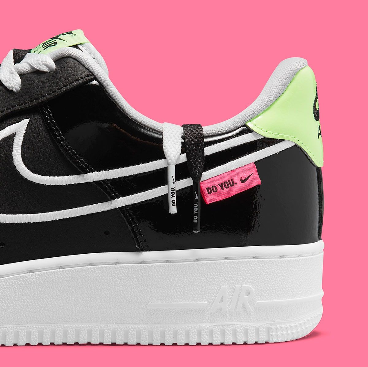Like those pairs, this Uptown boasts both a dark black and bright white base that enables its accentuating highlighter hues to pop. Here, it’s anchored in black tumbled leather forward of the quarter panel — one which is served up in a patent leather finish. Solid white sole units, liners, and Swoosh outlines provide the minimalistic base to let the pops of volt and neon pink peak. Tongue tags and heel overlays opt for the former, whilst pinks are reserved for the dubraes and lateral “Do You.” tags. The pair is then completed with dual interlocked laces of black and white, and two-tone neon insoles.