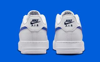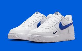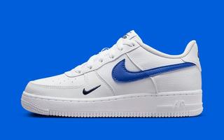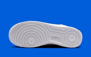 For the most part, the pair assumes a classic triple white arrangement, though leathers are treated to a lightly tumbled finish. Here, Nike has taken the Sp[ring/Summer season into account, as it’s added some breathability to the midfoot and tongue through mesh materials. It’s royal blue Swoosh overlays are textured to match, while an added mini Swoosh of navy joins color-marched branding at the tongue and heel to complete the design.