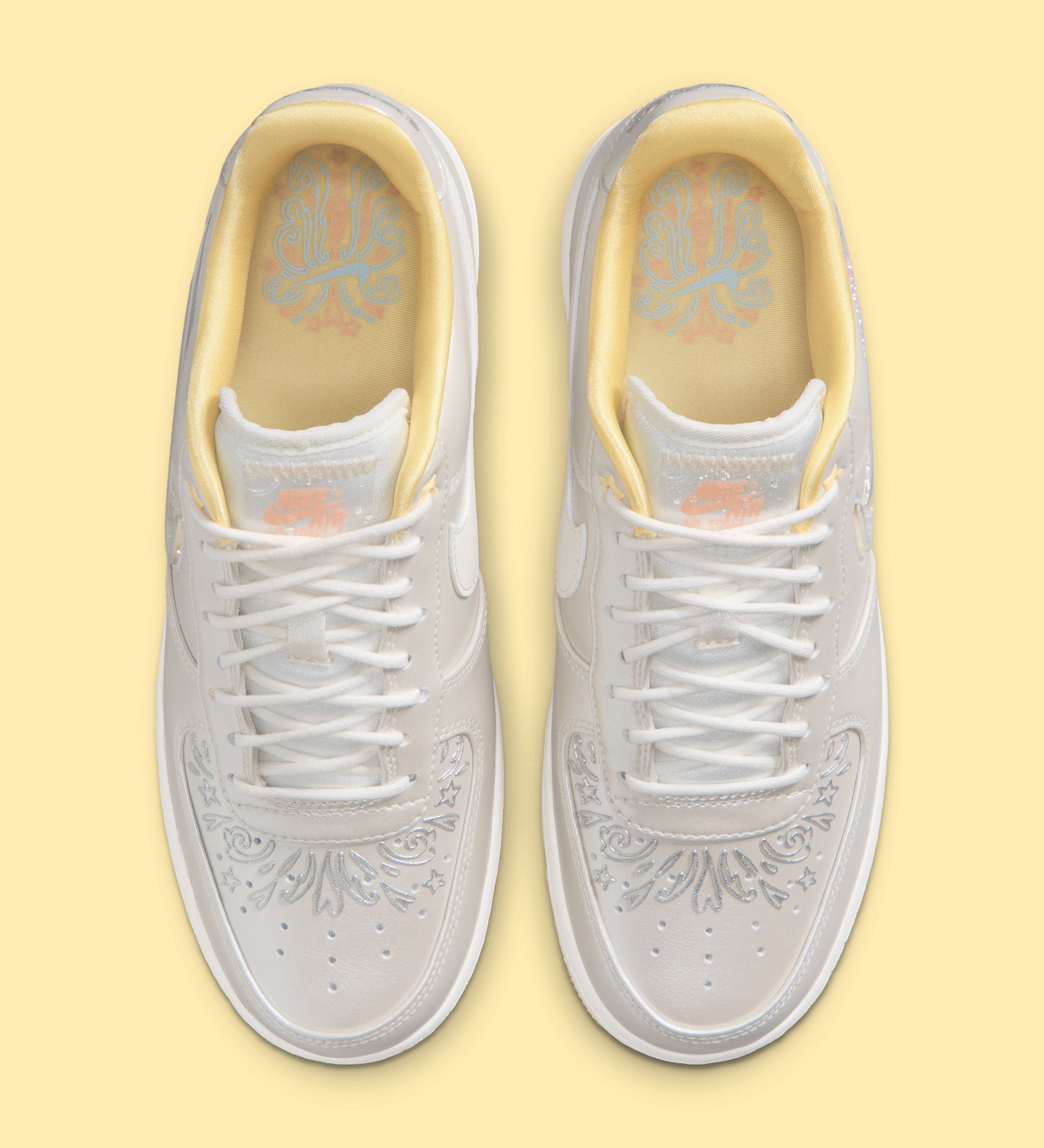 Elsewhere, the pair introduces soft yellow accents along the inner lining and outsole, adding a warm, summer-ready touch. The tongue features a sheer finish with Nike Air branding, while small star-shaped eyelets and delicate etched patterns across the toe box bring in a slightly whimsical feel without overwhelming the design.