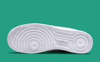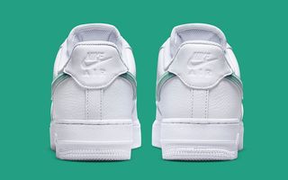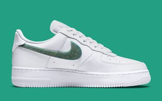 Anchored on a classic all-white construction, the pair presents a tumbled leather build, with smooth, debossed brand panels at the tongue and heel. It’s kept all-white at the laces, liners, and sole units, too — even the dubraes feature a white enamel finish. All of this sets up the pair’s champion, the green glittered Swoosh, which rests at the midfoot in hard plastics.