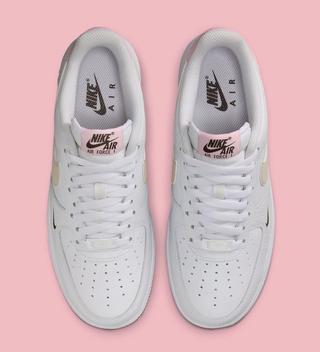 Staying true to an all-white base, the sneaker is accented with a Swoosh logo in a sandy tan hue, subtly contrasting the pristine white. Adding chcoalte brown on the miniature Swoosh at the forefoot and heel further enhances the design's connection to the Easter season, so too the soft pink accents that adorn the tongue label and heel tab, lending the sneaker a gentle, festive touch.