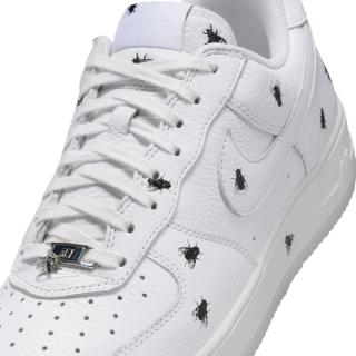 The tumbled white leather base gives off premium vibes at a glance, but a closer look reveals the swarm. Black housefly graphics are printed all over the shoe—including the side panels, forefoot, and even the midsole—creating an intentionally unsettling aesthetic. Despite the chaotic visuals, the design retains the timeless AF1 silhouette and sole unit, complete with classic stitching and perforated toe box.