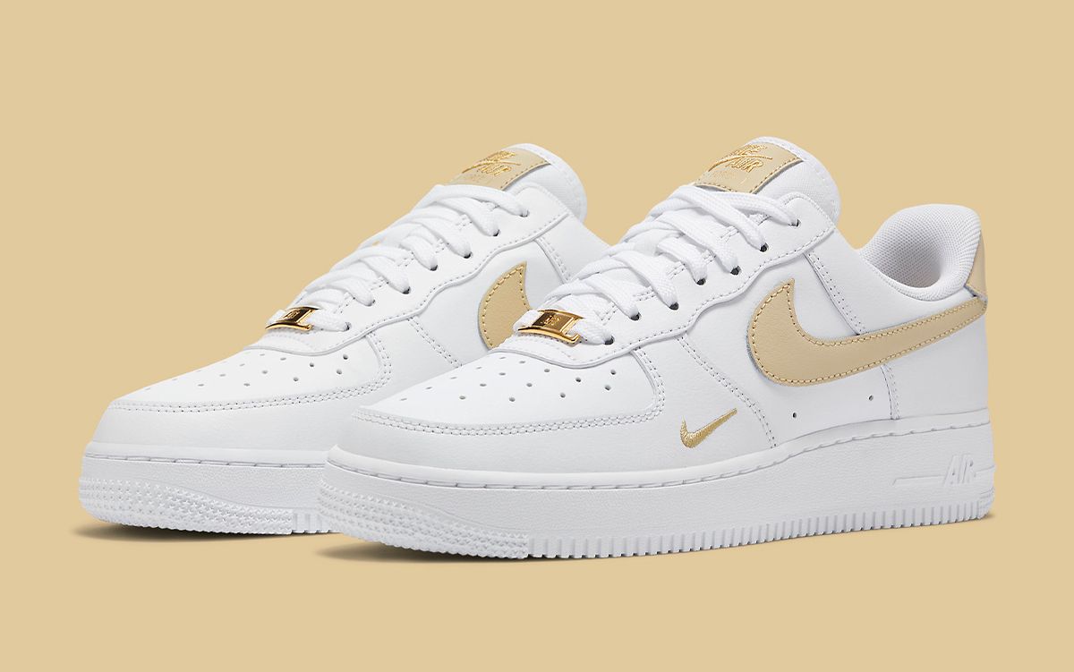 Starting from a staple all-white base, the pair’s Swoosh, tongue, and rear overlays indulge in a lightly tumbled ‘Rattan’ leather for elegant contrast. The latter two panels come pinned with golden brand embroidery, with the thread continuing to additional forefoot mini Swooshed, too. Dubraes are upgraded to a metallic gold finish, while insoles arrive in a tonal pink dye to complete the design.