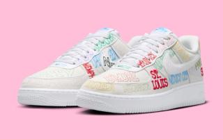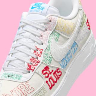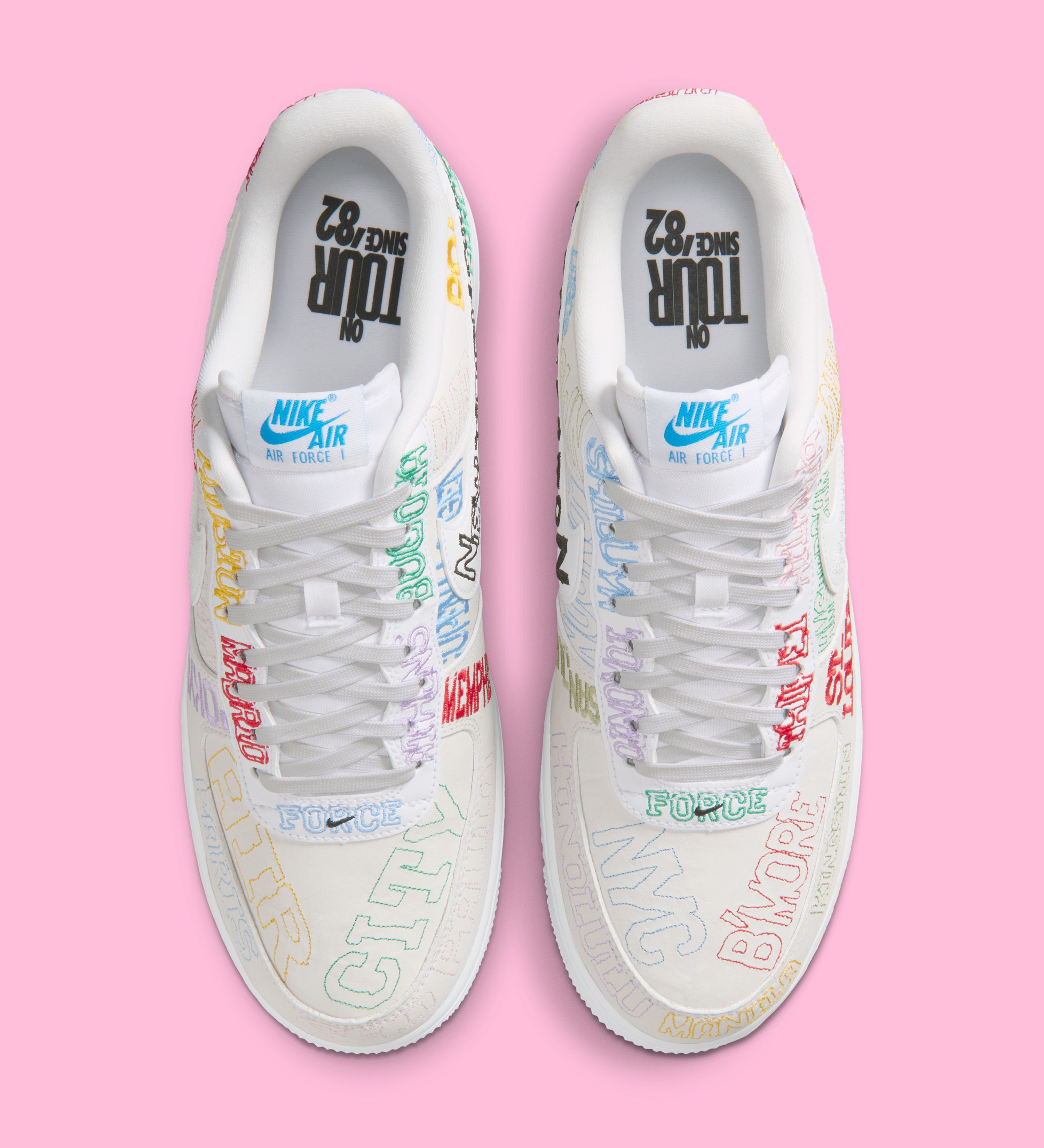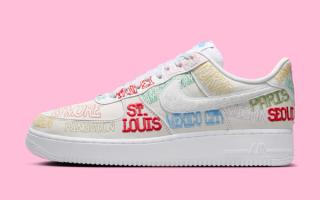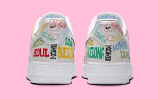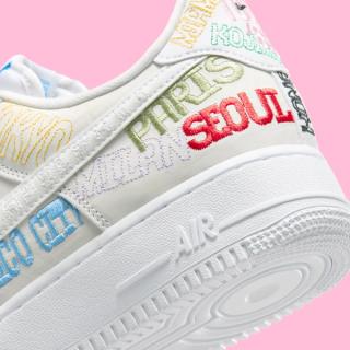 Each location is stitched in distinct type treatments and colors, giving the pair a scrapbook-like energy without overwhelming the classic AF-1 framework. Standard Nike Air branding appears on the tongue in bright blue, while the traditional white sole unit keeps things clean and wearable.