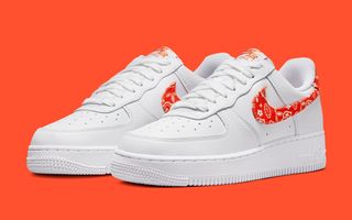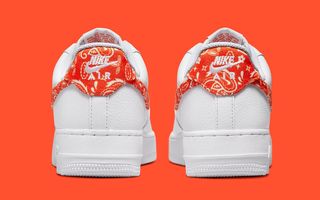 Like the others thus far, this one arrives in a simple tumbled white leather construction; the pair boasts nothing out of the ordinary — save the aforementioned prints — with white nylon tongues, white liners and laces, and all-white sole units serving as its base. From there, you’ll see orange and white paisley prints on textile draped over the Swooshes and heel overlays — and if you look closely, you’ll notice that Nike has worked in mini Swooshes into the design. completing the colorway is a handful of orange branding hits at the tongue and insole, as well as a set of white enamel AF1 dubraes at the forefoot.