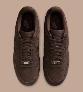 The upper is constructed entirely in Baroque Brown suede, with paisley motifs embossed across the toe, quarter panels, heel, and Swoosh. The pattern adds visual depth without relying on contrast, keeping the execution understated and cohesive. Subtle star details are integrated into the embossing, paying homage to Air Force 1’s heritage without distracting from the overall material story.