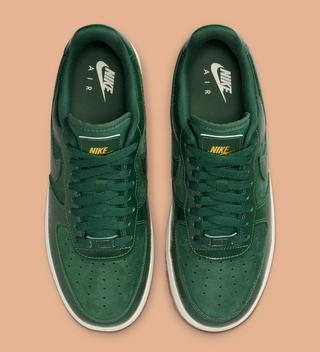 This newest rendition, like its beige predecessor, takes a deep dive into a singular color theme, presenting a monochromatic 'Forest Green' that cloaks the shoe in a seamless visual narrative. The base maintains a subdued presence with its matte suede construction, setting the stage for the show-stealing patent leather croc overlays. These high-gloss, textured additions elevate the sneaker's aesthetic, delivering a luxe feel that bridges the gap between luxury and the iconic street style synonymous with the Air Force 1 lineage.