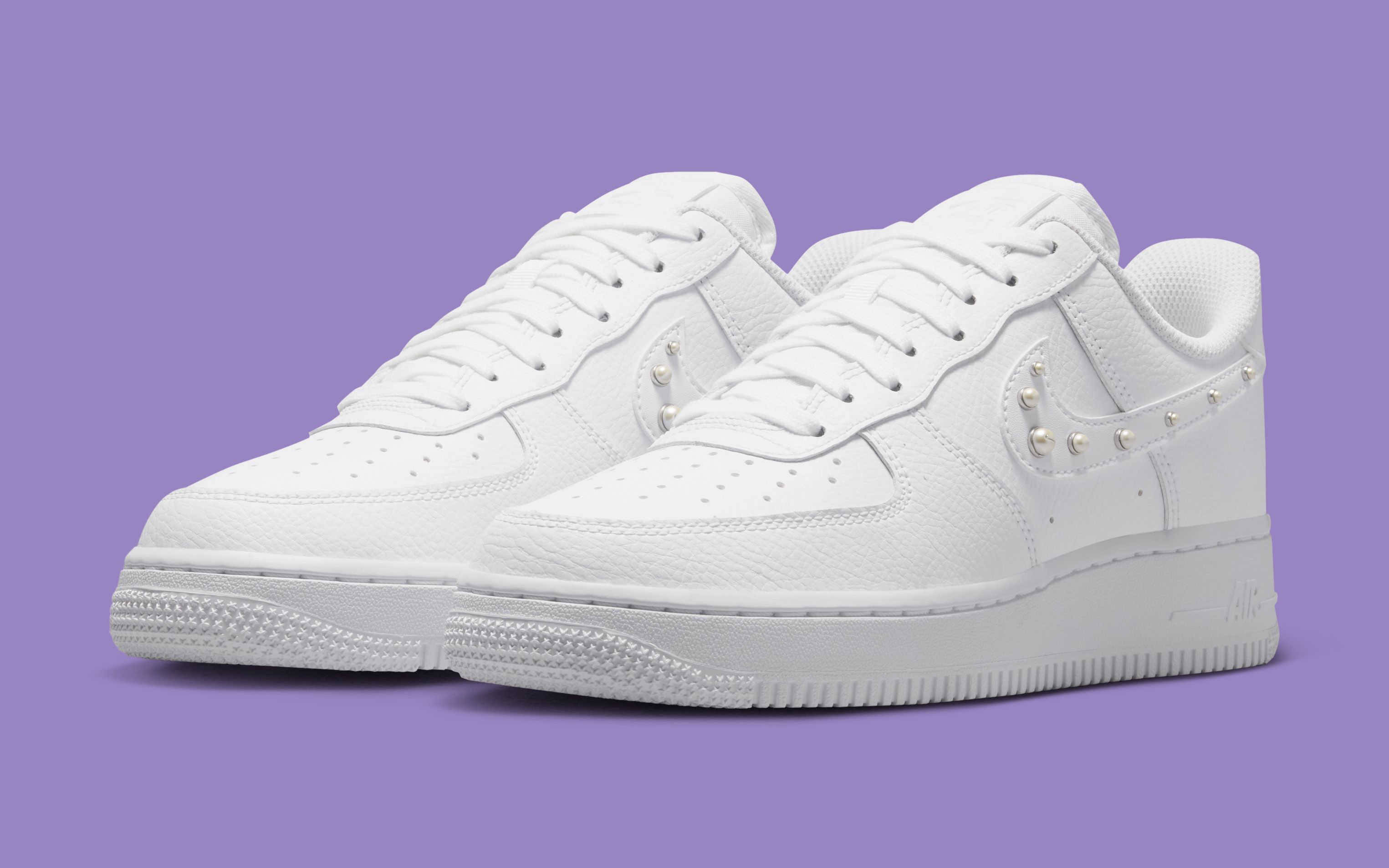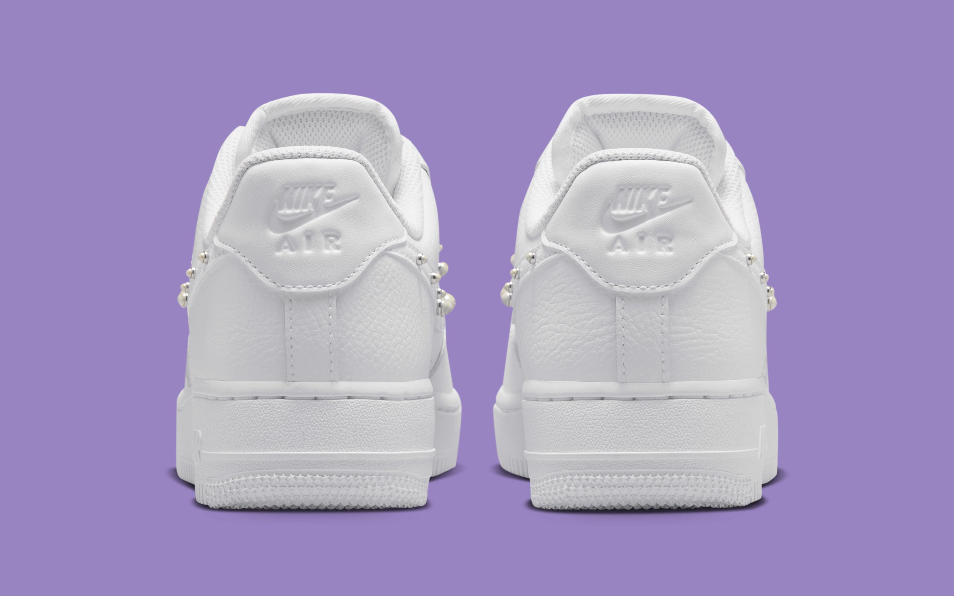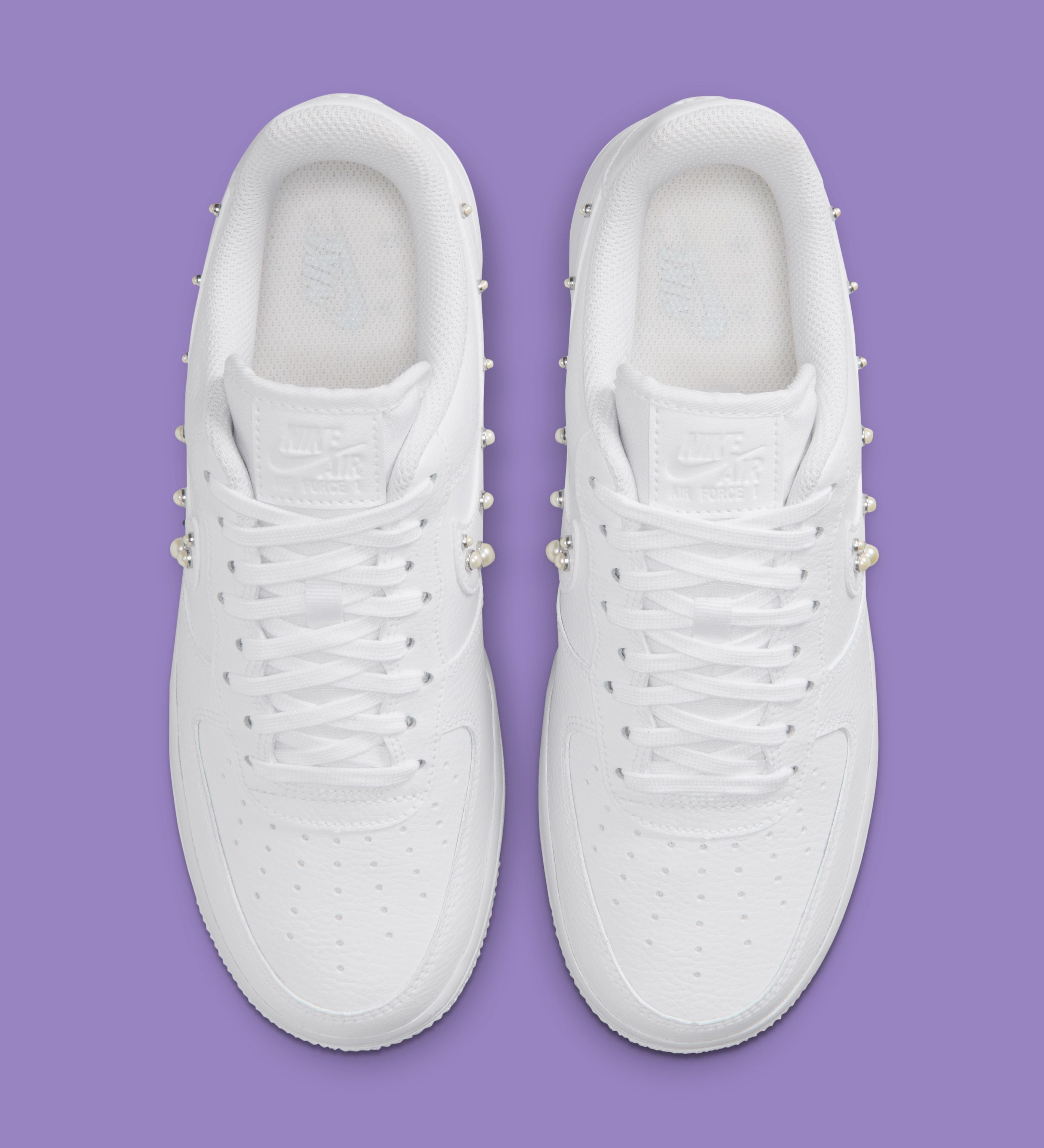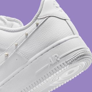 The defining feature comes at the Swoosh, where pearl-like studs are embedded directly into the leather overlay. Varying slightly in size, the studs introduce dimension without disrupting the shoe’s clean finish. The detail extends subtly toward the heel, giving the pair a consistent, decorative edge while maintaining a restrained overall look.