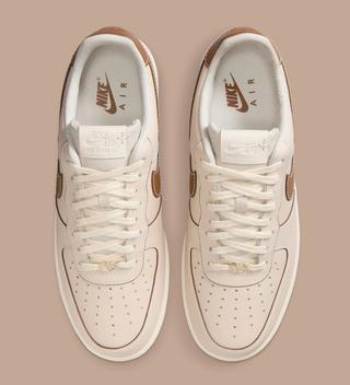 The sneaker boasts a soft, pearl white leather upper with a muted light beige tone. This understated base is contrasted by russet Swooshes and heel overlays, attached with crisp white stitching for added definition. A herringbone twill tongue introduces a subtle textural element, while leather tongue tags and gold dubraes lend a luxurious touch. Below, an all-sail sole unit completes the refined design, striking the perfect balance between simplicity and sophistication.