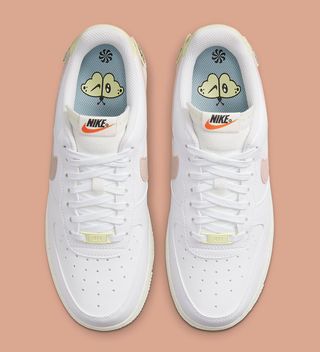 Anchored in a smooth white leather base, the pair then presents a few tumbled finishes, including tonal white leather tongues, dusty pink Swooshes, and lemon rear overlays. The former and latter are fixed with yellow tack stitching, with further hits of the hue at the set of dubraes and the lemon-peppered sole units. The champion feature of the pair is the pastel-popped flower and butterfly heel patches, the latter reappearing again on the insoles above Nike’s Move to Zero Pinwheel motif to complete the design.