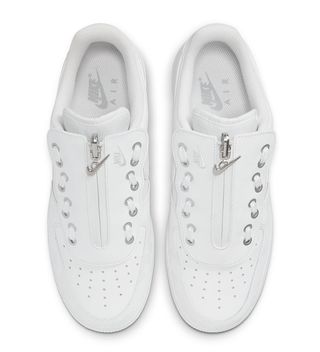 Noticeably, the pair’s zip-up, removable shroud overly is by fra the pair’s taking point. Its u-shape design is finished with waves inspired by the traditional eyestay lines, and is fixed with brushed chrome eyestays and metallic Swoosh zippers. Underneath, the pair appears to arrive in fairly standard triple-white style, save the tongue, which is spotted here briefly in a brandless textile weave. Rear embroidery is altered, too, with “AIR” lettering omitted and finished in a 3D thread.