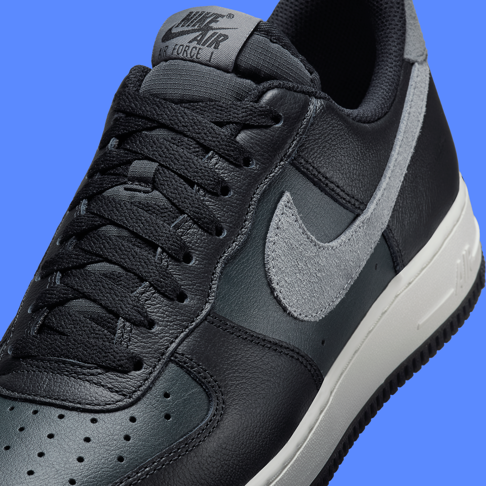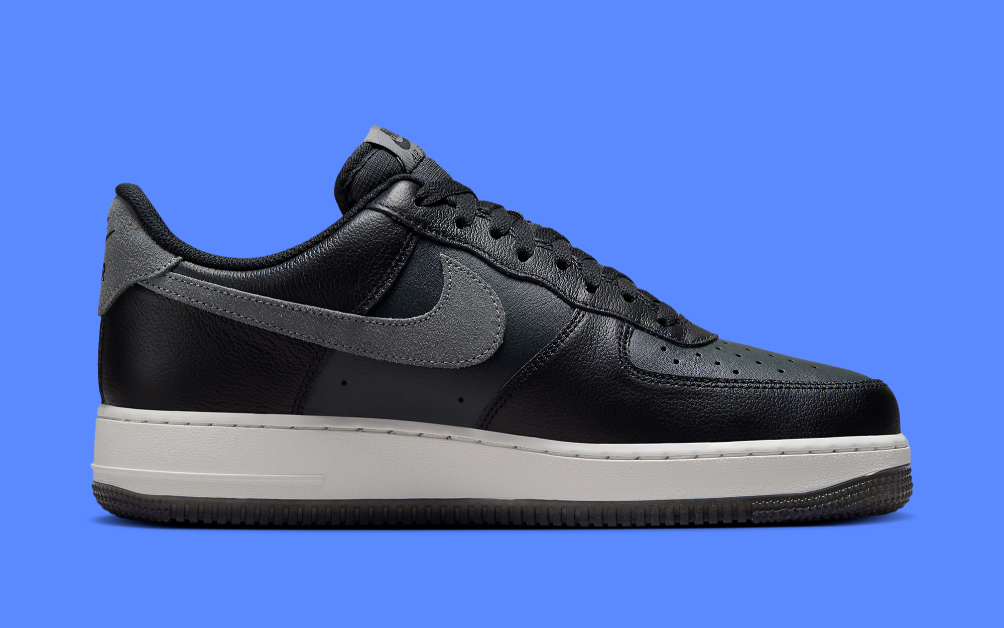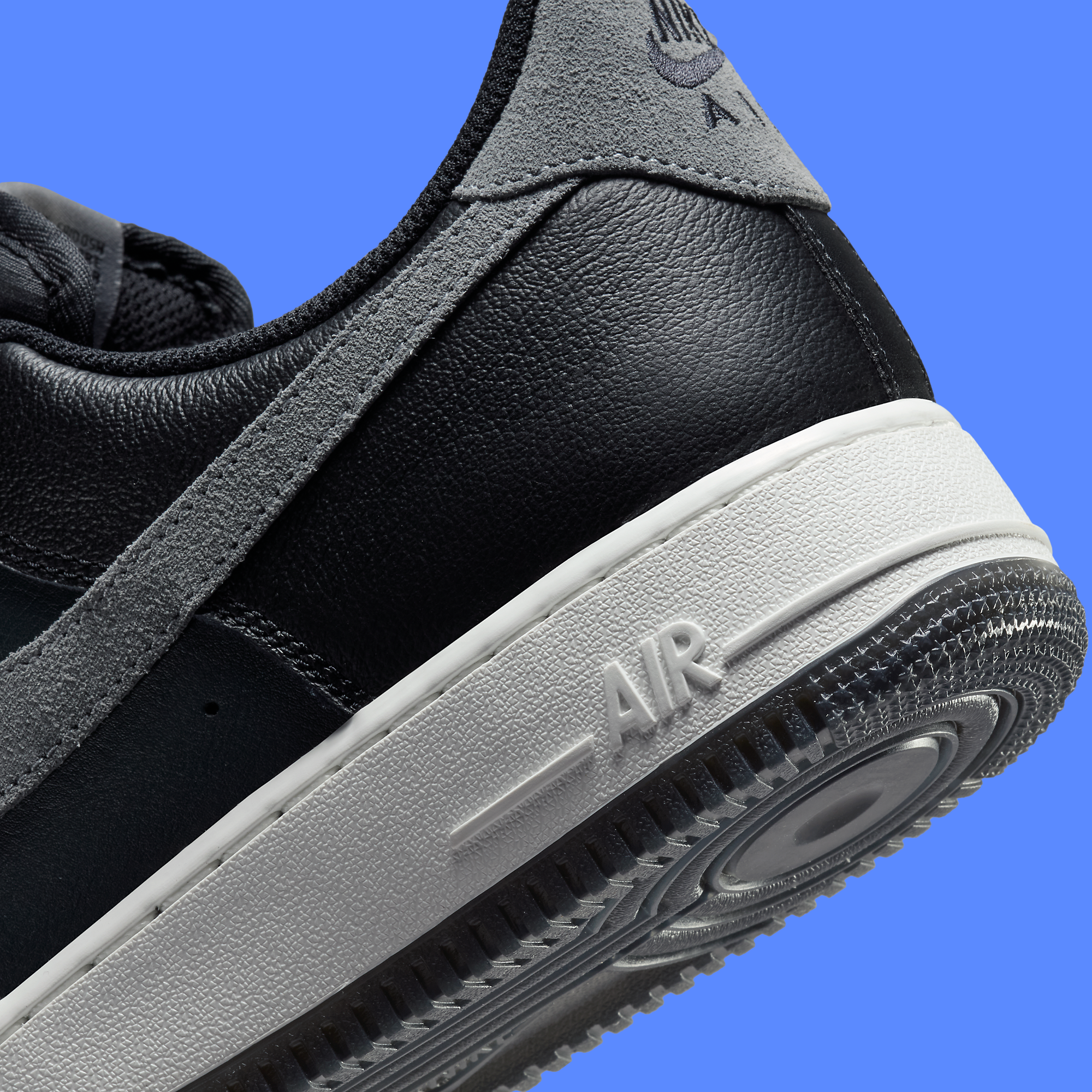 This edition of the Air Force 1 Low maintains the iconic look with a sleek black leather upper that provides a perfect canvas for the standout feature: a suede Smoke Grey Swoosh. The contrast between the dark body of the shoe and the lighter Swoosh adds a layer of visual interest and sophistication, making it a versatile addition to any wardrobe. Complementing this is the crisp white midsole, a signature element of the Air Force 1 that not only enhances the aesthetic but provides the renowned durable cushioning that has made the shoe a favorite both on and off the court.