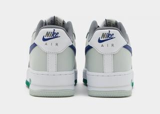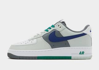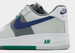 With tumbled white leather toes, smooth light bone leather overlays, and dark grey mid-panel, tongues, and liners, the particular pair stays mostly monochrome. It's brought to life via bold Deep Royal Swooshed and pops of green on the laces and multi-color sole unit below.