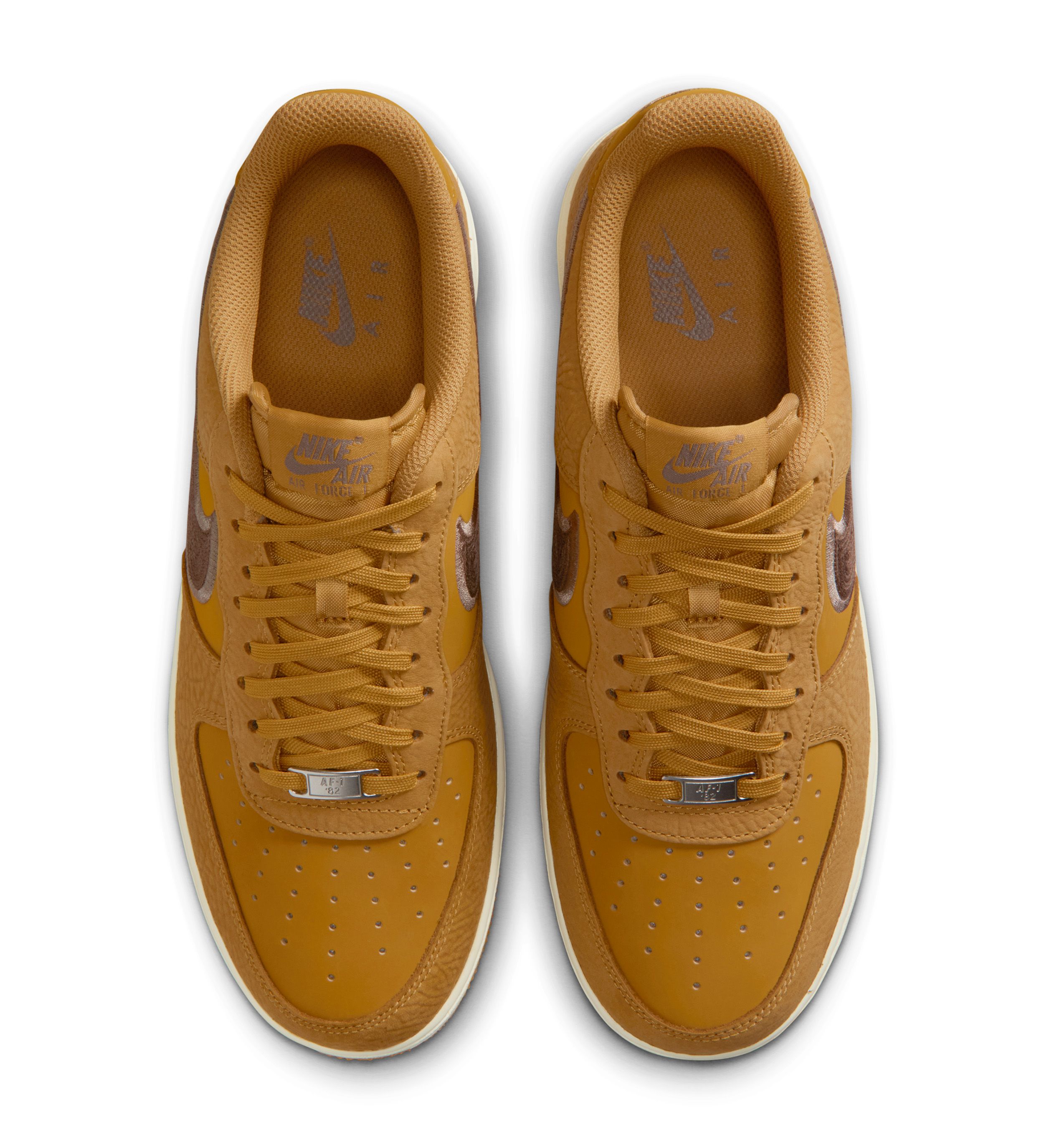 Branding remains understated throughout. A tonal lace tag sits at the base of the laces, while the heel features classic Nike embroidery in a matching hue. The tongue stays traditional with woven Nike Air branding, blending seamlessly with the Wheat-colored laces and padded collar.