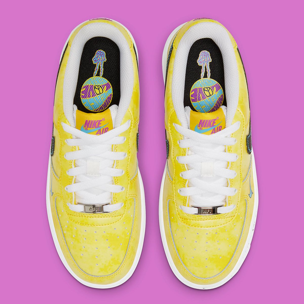 While not as colorful (or as era-specific) as KD’s offering, this AF1 still packs a serious punch. Striking yellow uppers are finished in a subtle tie-dye-like effect, with jet black Swooshes and contrast sole stitching providing some pop. Complimentary colors of aqua and fuchsia around the pair adds some liveliness, but the majority of the pair’s character comes from the drippy Swoosh and rear smiley, and the ball-spinning skeleton motif riding the insoles. The latter reads “Peace, Love and Basketball” — a nice touch to finish the harmonious-hefty sneaker.