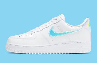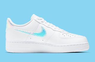In a similar vein to the AF1 “Triple White Pixel” recently announced here, this latest addition to the forever expanding catalog offers another digitalized motif. The all-white premium leather upper with matching rubber sole unit underfoot provides the ultimate clean crisp backdrop for the remainder of the design. The blue shimmering pixel swoosh slightly changes color depending on its composition and looks like it’s straight out of an 80’s arcade game, matching heel and tongue overlays with “Nike Air” branding continue the theme. Completing the design is the black pixeled branding on the insoles.