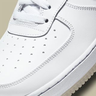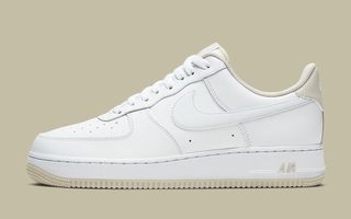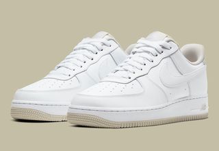 A clean white base is perfect for sunshine, while its muted tan accents retain a cloudy-weather mood. It’s blocking is simple; a classic triple-white base has swapped out the heel overlays, liners, tongue tags, insoles, outsoles and midsole “AIR” branding for shades of light tan. Purists will also notice the lack of dubraes and the inclusion of a soft tumbled leather on the Swooshes, too.