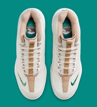 The shoe further embraces the spirit of Seattle with eye-catching green and tan Swooshes, shaped like diamonds, at the forefoot. Additionally, the lateral TPU plate at the heel takes on a grid-like aesthetic, mingling black and green shades.