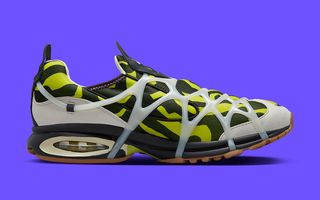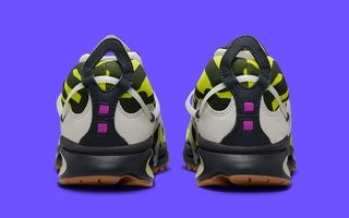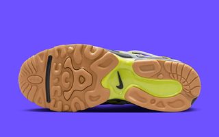 There’s a lot to take in, so let’s take it a step at a time. Firstly, the pair presents with a neoprene upper of Bright Cactus and Anthracite zebra print, with milky-white cage overlays and TPU tubing. Tonal tan suede caps the toe and heel, with black and gum sole units underfoot showing a slight peppering of color. Back up top, Nike has tacked on branding of pink, with collar stitching and insole Swooshes to match.