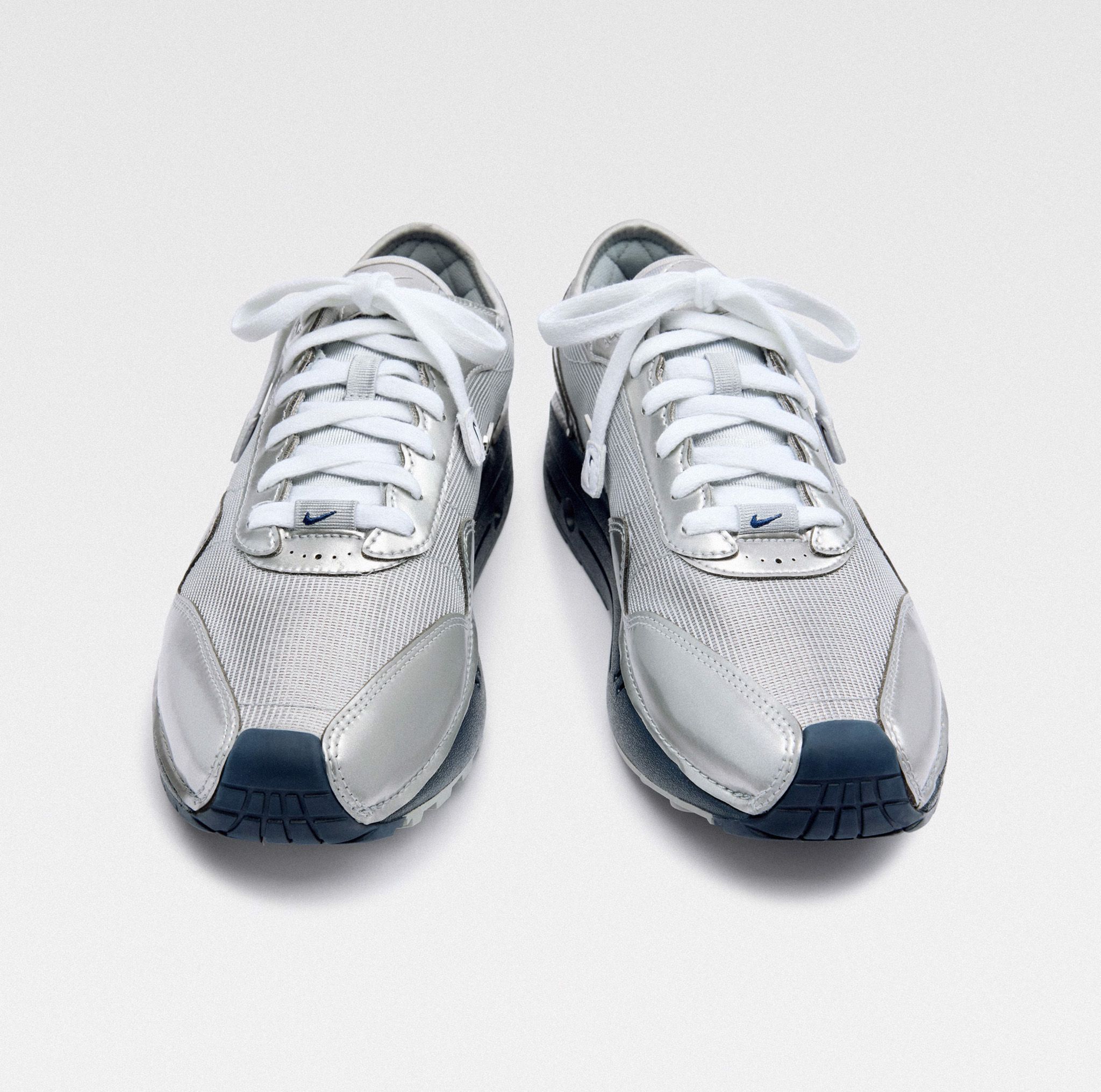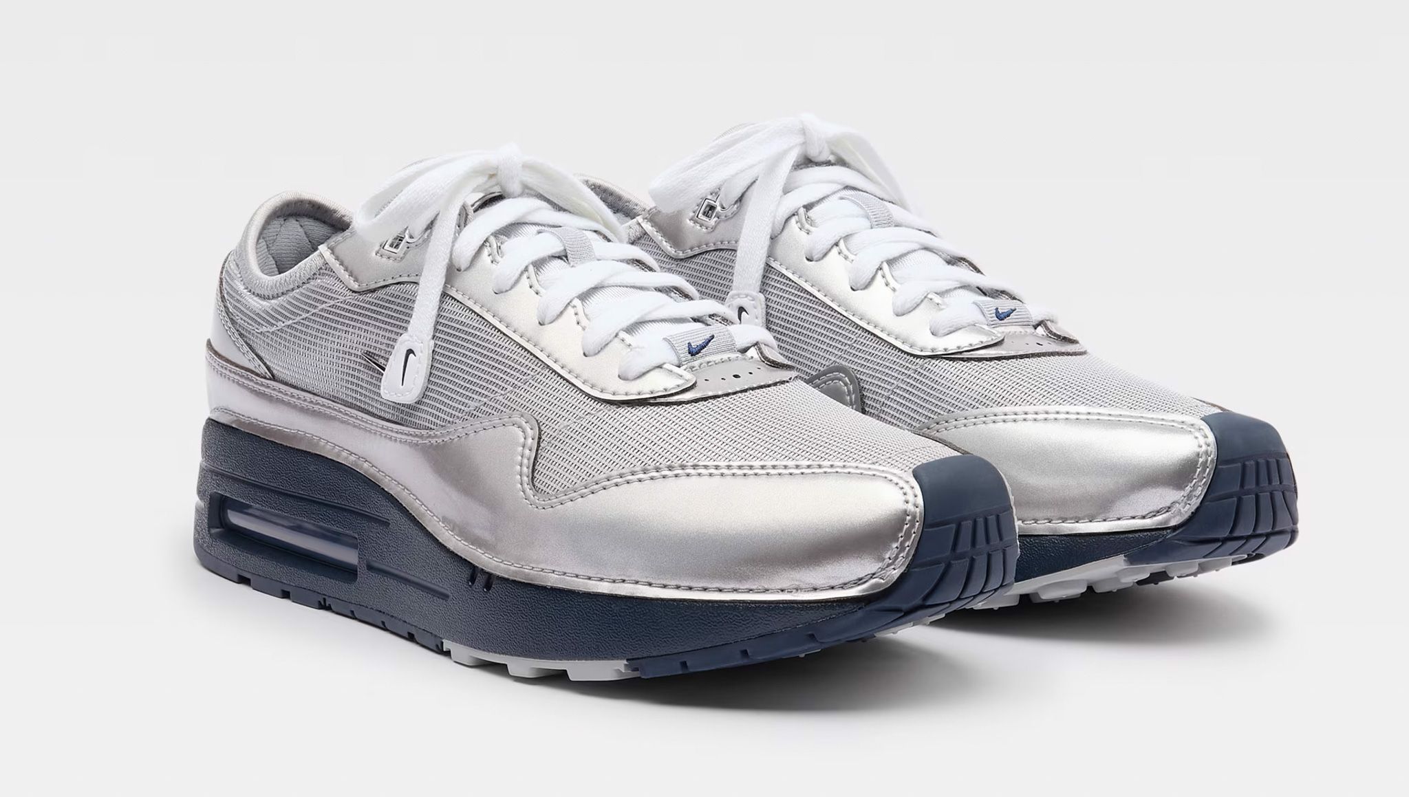 The blue variant of the pack offers a striking metallic silver upper, reminiscent of the iconic 'Silver Bullet' colorway, but with a twist. The deep navy hue of the outsole adds a depth of color, creating a sophisticated balance between classic and contemporary aesthetics.