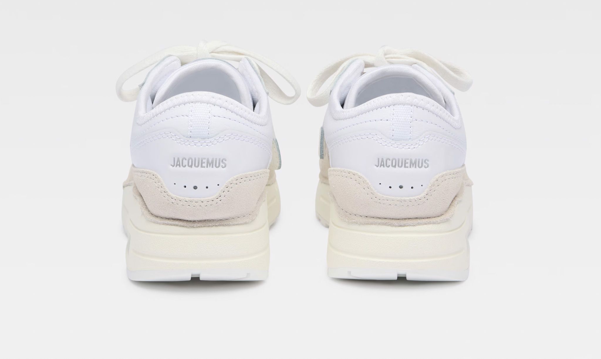 Next, the "Summit White" iteration presents a more subdued yet equally sophisticated palette. It features an array of white hues, with the mid-body in a suede darker white shade contrasting against a bone-white midsole. This colorway epitomizes JACQUEMUS's flair for understated elegance.