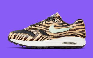 From Black Cat Jordan 4s to leopard print Air Max 90s, Nike’s golf division has clearly been fixated on faux animal furs of late — and this new Nike Air Max 1 Golf “Tiger” continues that narrative.