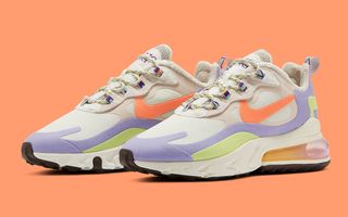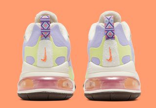 This aforementioned earthly inspired inclusion uses beige and tan suedes to construct the foundation of the upper which plays host to desaturated violet and lime green suede overlays throughout the upper deck. Down below at the bedrock of this pair we see a tan React midsole unit which fully encapsulates the large semi-translucent 270 Air cushioning techs that have been tinted with an orange-to-purple gradient, a white and brown glittery rubber outsole to provide superior traction. Completing the design and offering an abundance of character is the orange swoosh, multi-colored laces, beacon-print lace stays and heel tab, and the sheepskin like lining for added warmth and insulation.