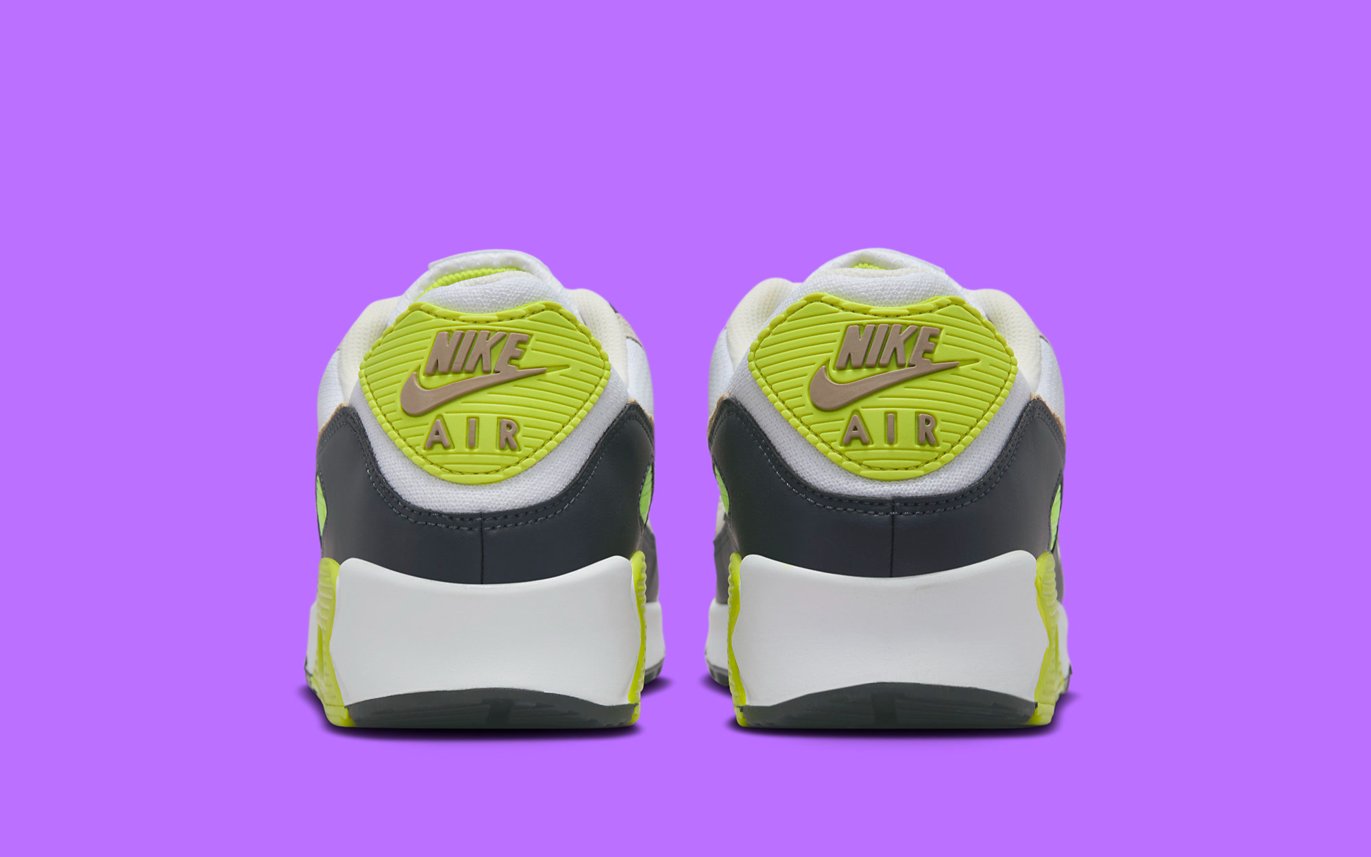 Anchored in white mesh, the pair proffers overlays of light tan and suede Swooshes of Khaki with Dark Smoke Grey mudguards. Vibrant volt pops pepper the Air cassette, branded paneling, and forefoot eyestays to complete the design.