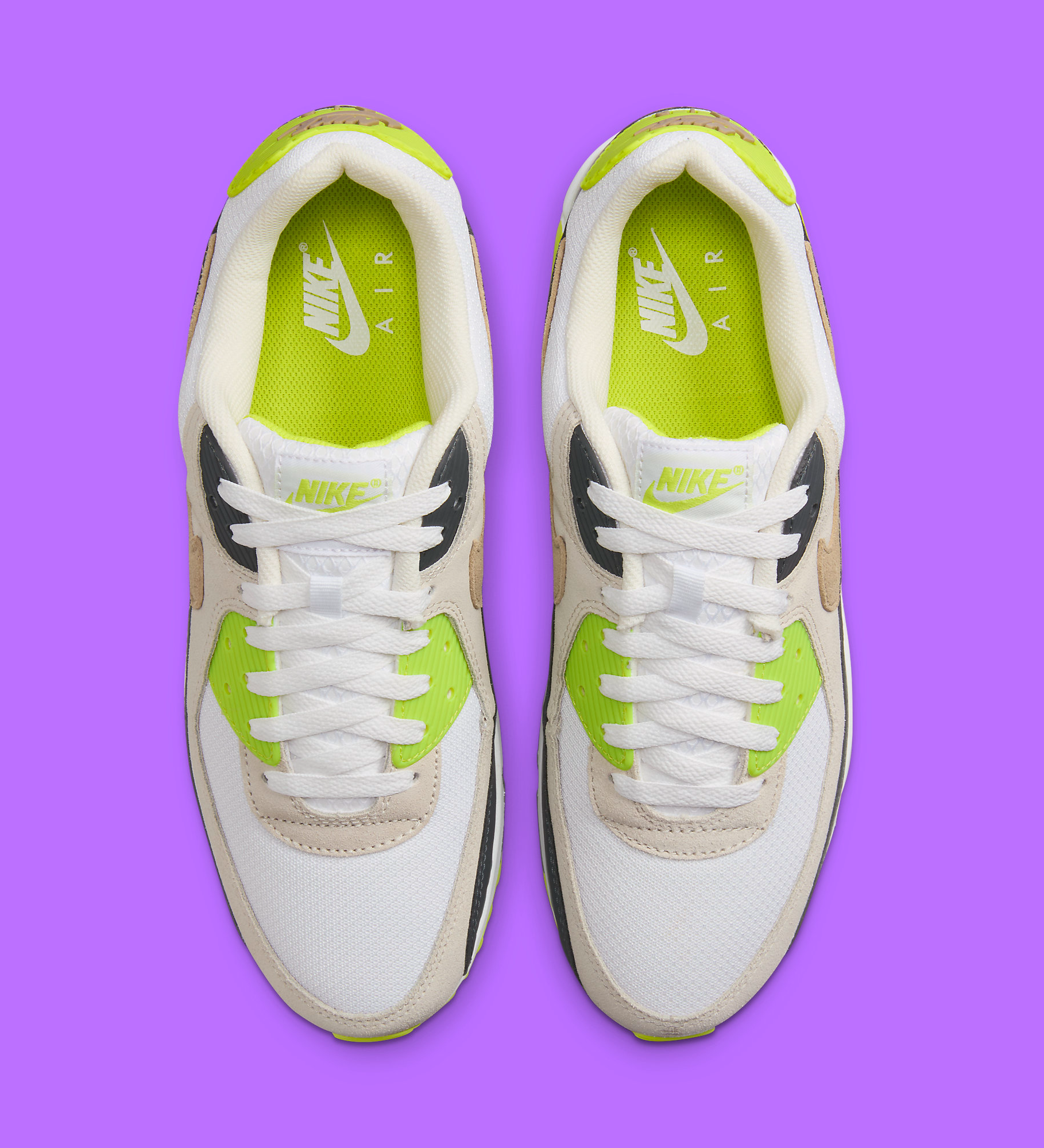 This new variant of the Air Max 90 is dressed in a tasteful combination of White, Cyber, and Khaki — an unusual mix of hues.