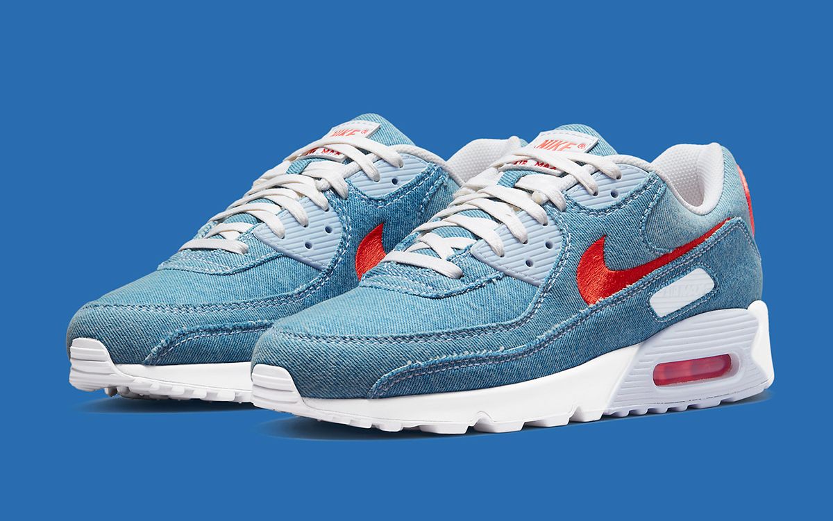 The Air Max 90 “Denim” is the latest Nike icon to join the Swoosh’s summer collection, with the release loosely attached to a Washed Denim Blazer Mid and Dunk High that don the same red, white and blue hues.