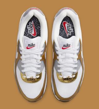Keeping in theme with the others from the pack, this Air Max 90 delivers the shimmering metallic finishes across the overlays, sited here with gold over the midfoot and toe, and silver dressing the profile guards. The colors are matched at the profile brand panel and eyestays/heel respectively, with rich red branding popping through on the latter. Once again, the pair is fitted with decorative dubrae jewelry that reads Nike in cursive and sits atop a fairly simple sole unit of white and black. The pair is then completed by the pack-specific safari-print insoles, and retro branding flushed throughout.