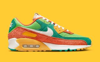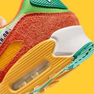 Like the previous navy and black Air Max 90 from the pack, this too boasts a heritage running charm thanks to its throwback nylon upper, crimp-cut suede overlays, and exposed-foam tongues. Retro tags at the tongue match “AMRC” and “Beaverton, OR” tags on the lateral ankles, while vintage tear-away tags are tacked on the right shoe via a special chrome Nike pin. There’s also retro Nike branding throughout, and special graphic insoles (not pictured.) As you can see, its color scheme is gaudy as hell, pairing bright and mid greens with gold and red accents that bring the colorful era of 70s trainers back to life.