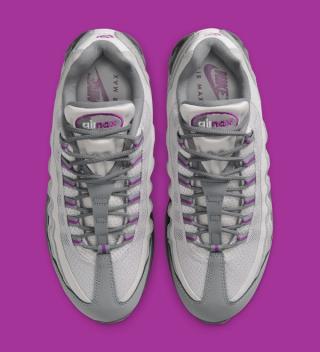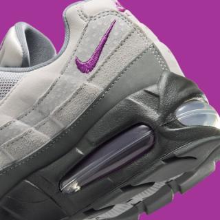 Underfoot, the design stays consistent with the model’s heritage. A dark grey midsole houses the visible Air units that define the Nike Air Max 95 "Cool Grey & Bold Berry," while the tinted air bubbles echo the same berry tone found across the upper details.