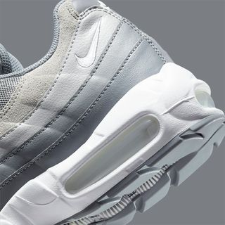 Instead of fine nubuck and patent leathers, the Air Max 95 opts for its own signature catalog of suede, mesh, and leather, each of which sports a subtly different shade of grey. It’s most noticeable at the cascading profile overlays, which works downwards in both texture and hue from light and shaggy to dark and smooth. Below that is a crisp white midsole that links back to the laces above, a-la the Air Jordan 11, and the pair is complete by solid grey outsoles, and white branding hits throughout.