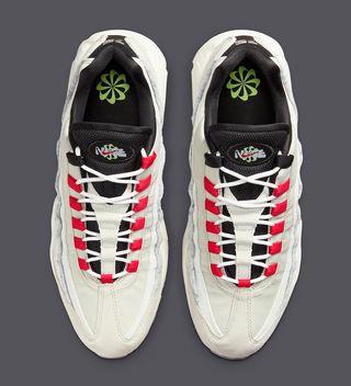It tacks on a mix of classic Air Max 95 textiles against contemporary recyclable elements and modern branding like double Swooshes juxtaposed with gained 60s-informed heel motifs. With such wide-spanning inspiration, the pair brings a fairly succinct style — and in timeless hues, too. Here, it’s tonal cream uppers and overlays of multiple materials, with black mesh tongues and lines joining pops of ref for a classic Swoosh look. Underfoot, a staple white midsole hosts two-tone Air supports, while a light grey Grind Rubber outsole rounds out the design.