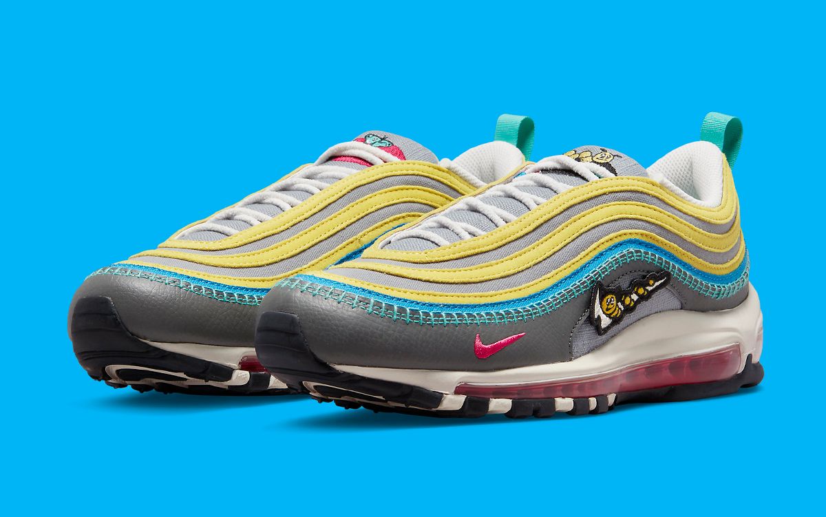 Nike’s latest sustainability series, the “Air Spung” collection, has certainly taken an otherwise serious agenda into something significantly more playful. Like their Happy Pineapple pack that hammed up the collection’s usage of recycled fruit fibers, this pack also plays on a key theme: rebirth. Taking something that was once used for another purpose, popping in the cocoon, and out comes a beautiful butterfly is exactly what Nike does with their recycled materials, and this second-up Nike Air Max 97 “Air Sprung” does just that.