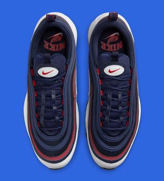 This forthcoming Nike Air Max 97 rendition takes a unique spin on the traditional American color scheme. The navy blue shade takes center stage, adorning not only the mesh foundation and tongue, but also extending to the laces, the outsole, and the leather piping that lines the shoe's upper edge. The red hue provides a striking contrast, highlighting the adjacent trims and logos. Meanwhile, white completes the patriotic ensemble, decorating the midsole and mudguard.