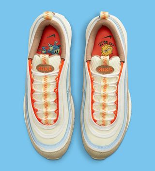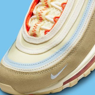 Locked to a creamy-beige base, the pair’s signature overlays look to a lighter cream hue, before introducing a streak of light blue and a full mudguard wrap of dusty tan suede. Special waffle tongues arrive in a light yellow hue, with laces, and wavy pulls following. Those are surrounded by orange accentuations to marry up with the midfoot Swoosh and Air supports, before creamy sole units and chocolate liners book-end the release. Adding some whimsical flavor is the pair’s special graphic insoles, while a crossover of playful and function rests at the heel via iridescent D ring decoration.