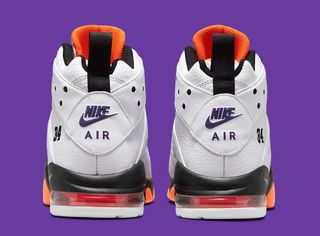 It shares significant DNA with the OG 34 of the same name, with white leather uppers popped with blacks, a bevy of purple Swooshes, orange Air supports, and black midsole detail; take a look for yourself below: