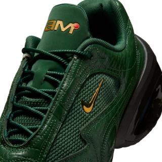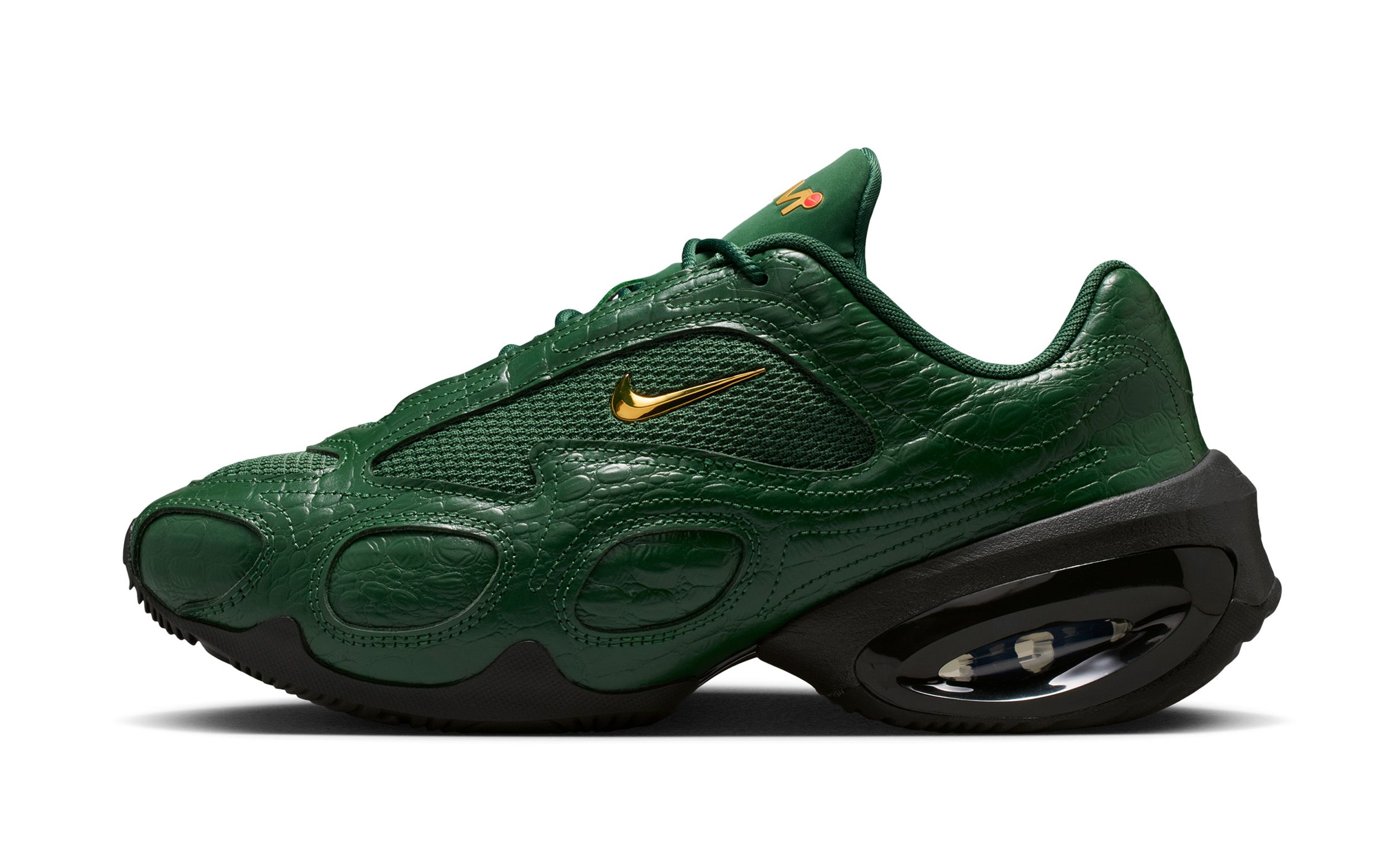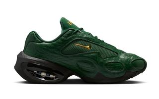 Dressed in a deep emerald green, the Air Max Muse swaps subtle texture for full-on presence. Croc-embossed overlays wrap the upper, giving the shoe a glossy, almost jewelry-like finish that feels closer to luxury leather goods than traditional performance footwear. Underneath, breathable mesh panels keep the design grounded in Nike’s running DNA, preventing the look from tipping too far into costume territory.
