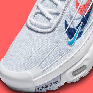 Clad mostly in a summery bright white, the pair looks to very few accentuations for the character. Most obvious is the pair’s multiple Swooshes in Navy, Grey, Infrared, and Cyan, but there is a tint of blue-grey on the rear caging and outsole, too. Staple TN fixtures at the tongue, insole, and outsole round out the design.