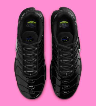 This version of the Air Max Plus distinguishes itself through a bold material choice, replacing the traditional mesh base with a rippled patent leather finish. The sneaker's enduring design is further refreshed with textile overlays along the sides, substituting the usual TPU pieces. Chrome elements appear strikingly on the profile swooshes, lending a futuristic touch to the predominantly black sneaker. Contrasting accents of blue and electric green enliven the badges on the tongue and spine, injecting vibrancy into the otherwise monochrome design.
